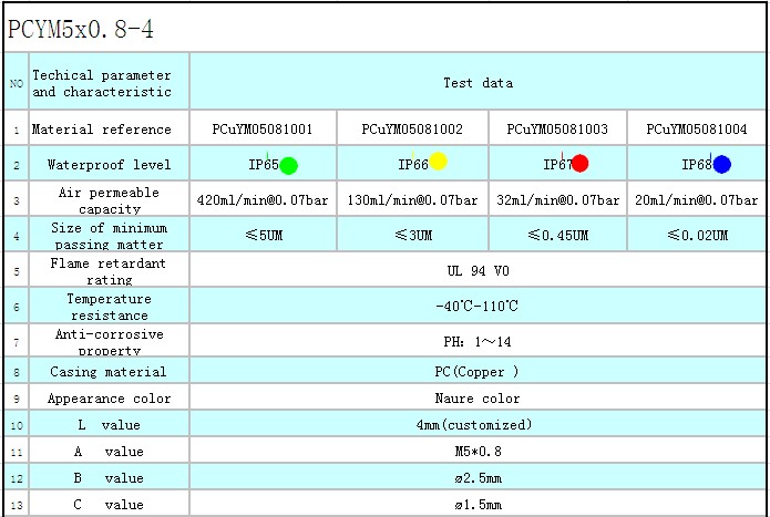 M5x0.8-4 Copper Screw vent is also called threads, respirator, waterproof breather valve.All of membrane materials of the product are imported from the USA.The casing is fabricated and formed with Aluminium alloy material. Membrane material and casing are integrated together with special process. It has characteristics such as stable performance, simple installation, long service time, high waterproof and air permeable performance and so on.