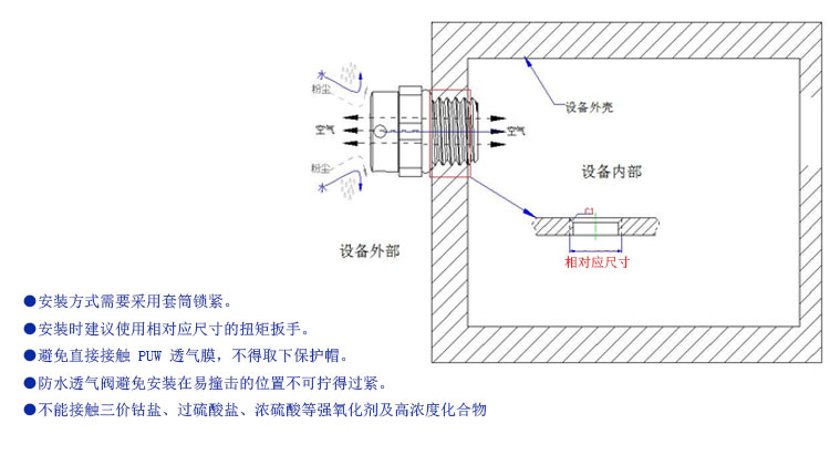3、安裝尺寸依據客戶選擇的透氣閥規格為準。對于2mm--3mm壁厚的設備建議采用蒲微M12*1.25尺寸的防水透氣閥。