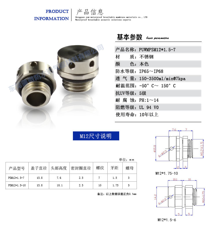 PSM12*1.5-7防水透氣閥又名螺紋型呼吸器、本產品膜材全部采用美國進口材料, 外殼不銹鋼材料加工成型,膜料與外殼通過特殊工藝結合在一起,具有性能穩定,安裝簡單,使用時間長,防水透氣性能高等特征。
