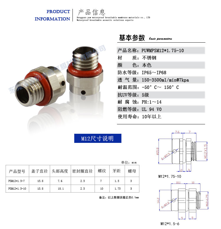 M12x1.75-10不銹鋼防水透氣閥產品膜材全部采用美國進口材料,不銹鋼外殼材料加工成型,膜片與外殼通過特殊工藝結合在一起,具有性能穩定,安裝簡單,使用時間長,防水透氣性能高等特征。