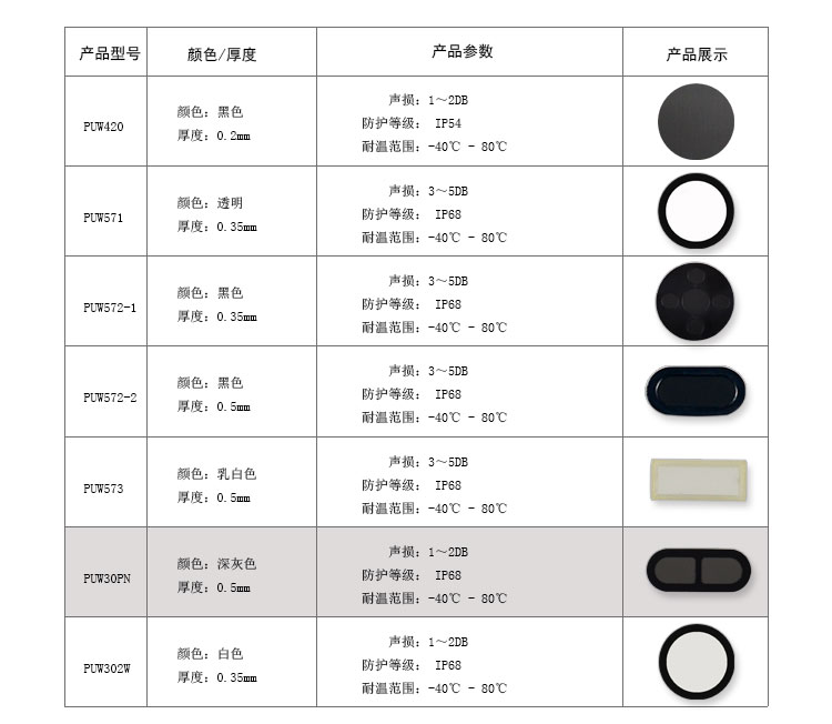 此產品特性為防塵防水透聲,用于各類防水手機,防水相機及防水電子產品上,即防塵防水同時也不影響其音質。